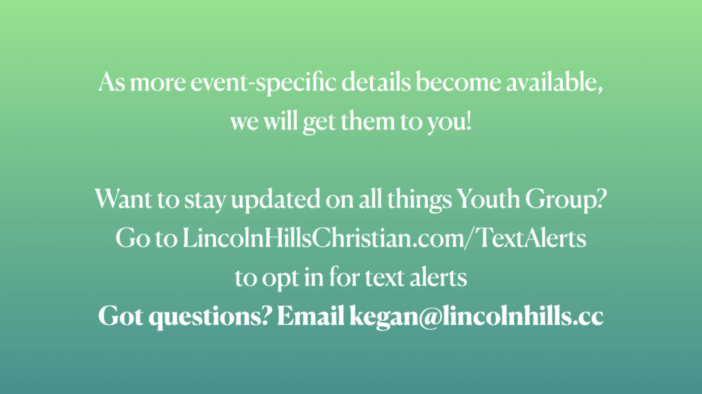 Youth Group runs year-round and meets in the Youth Activity Center (or the YAC for short). Youth Group may have cancellations due to South Harrison Community School Corporation’s winter weather cancellations OR due to short school breaks (Spring Break, Fall Break, etc.)